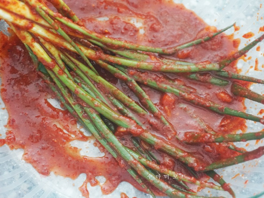 - 모든 양념이 고루 배도록 잘 섞으면 파김치 완성 직전입니다.