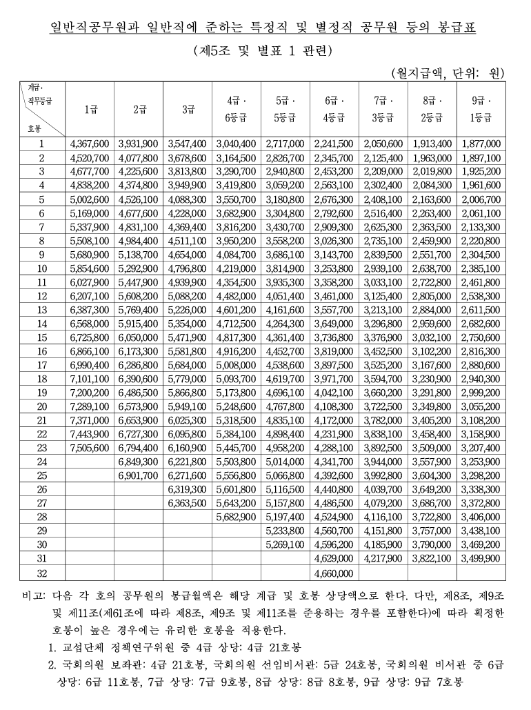 2025년 공무원 봉급 인상률, 봉급표