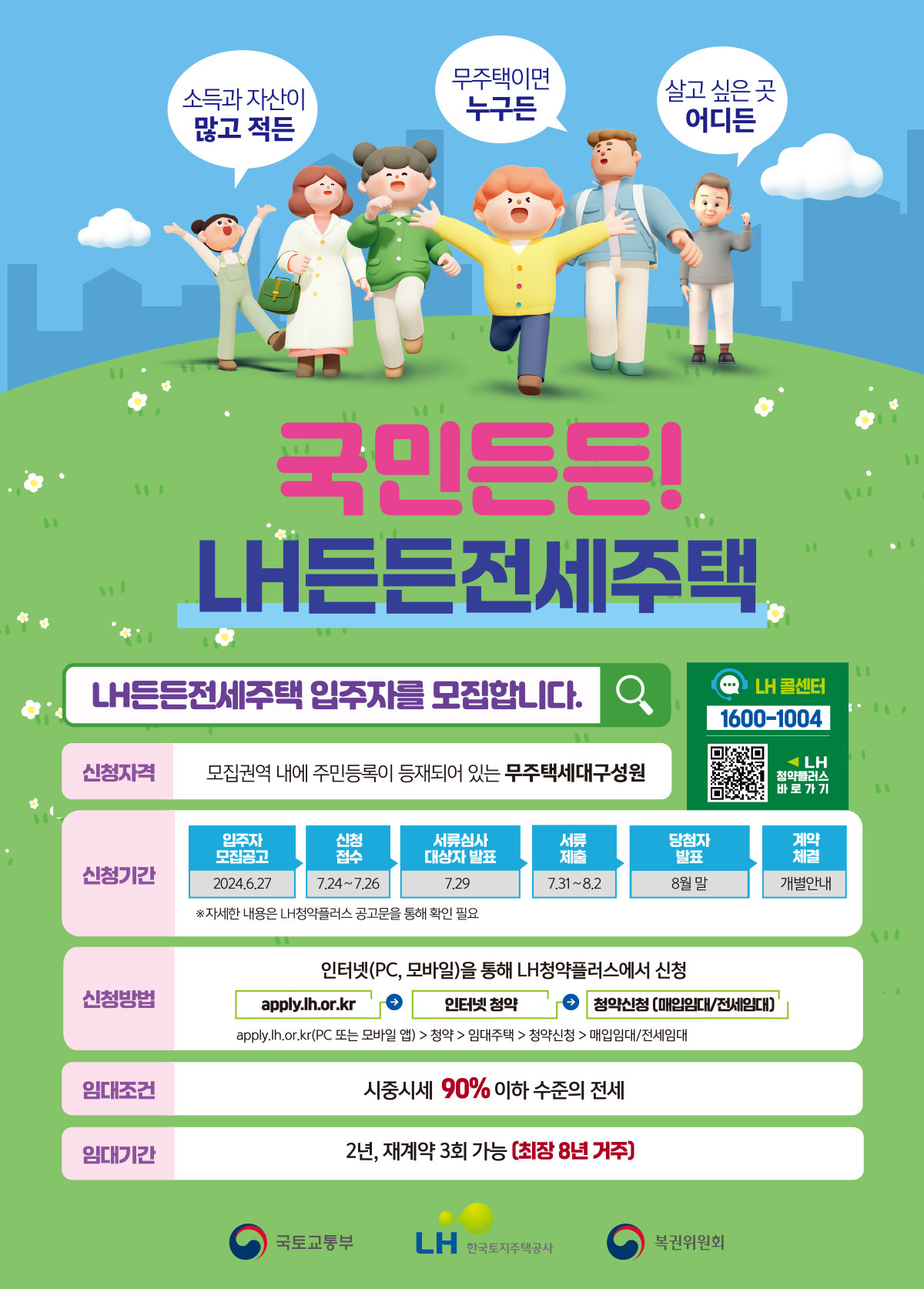 현재 한국토지공사 LH는 도심 내 면적이 넓고 생활환경이 쾌적한 신축 주택과 아파트를 매입하여 중산층 가구에게 공급하고 있습니다. 이 프로그램은 무주택 세대구성원들을 대상으로 시중 시세의 90% 이하 수준의 전세로 임대하는 정책입니다. 최근 LH 든든전세주택 모집 공고가 시작되었으며, 본격적인 신청은 2024년 7월 24일부터 가능합니다. 아래의 글을 통해 LH 든든전세주택 신청에 대해 자세히 알아보겠습니다.